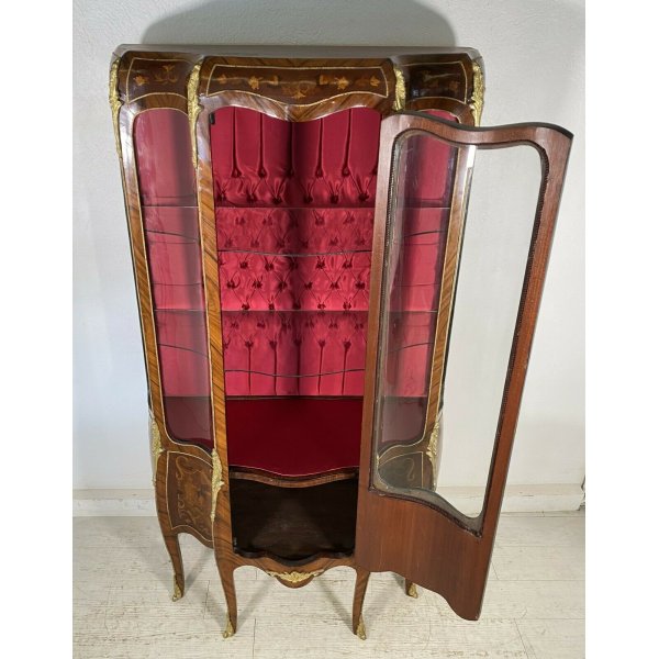 Fantastica antica vetrina in legno impiallacciato di noce dei primi del 1900 con 6 gambe, 2 ripiani, tutti vetri bombati, decori in ottone e uno scompartimento anche sotto la vetrina