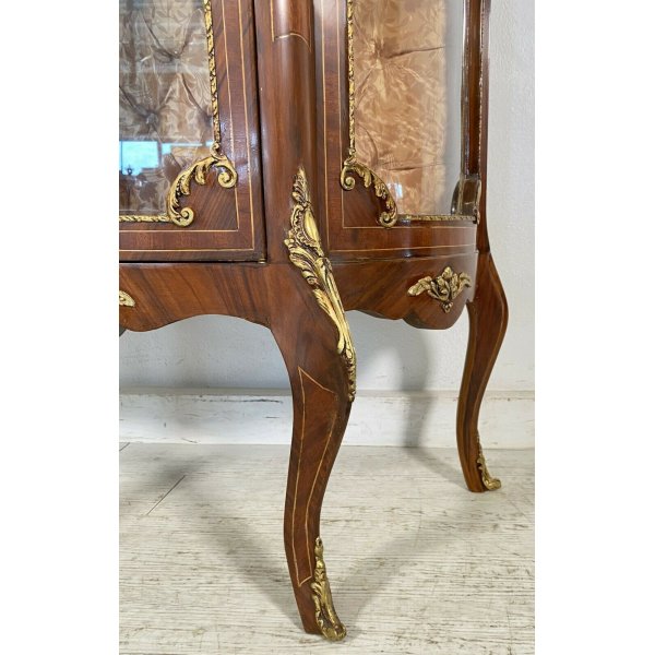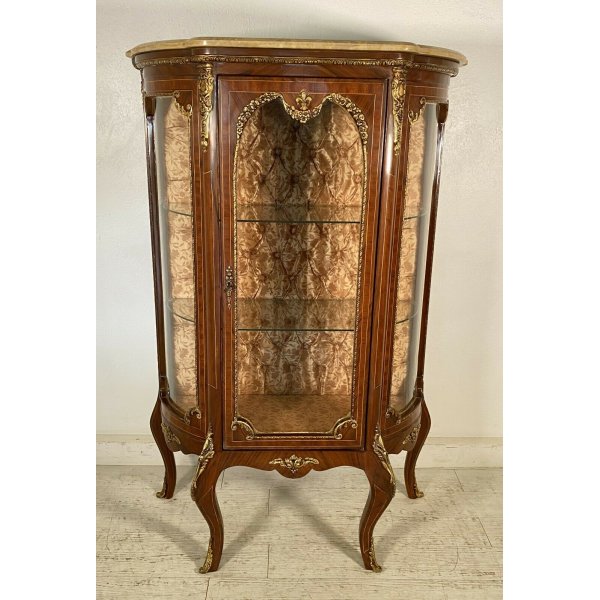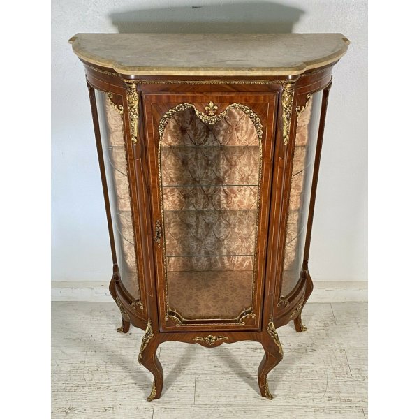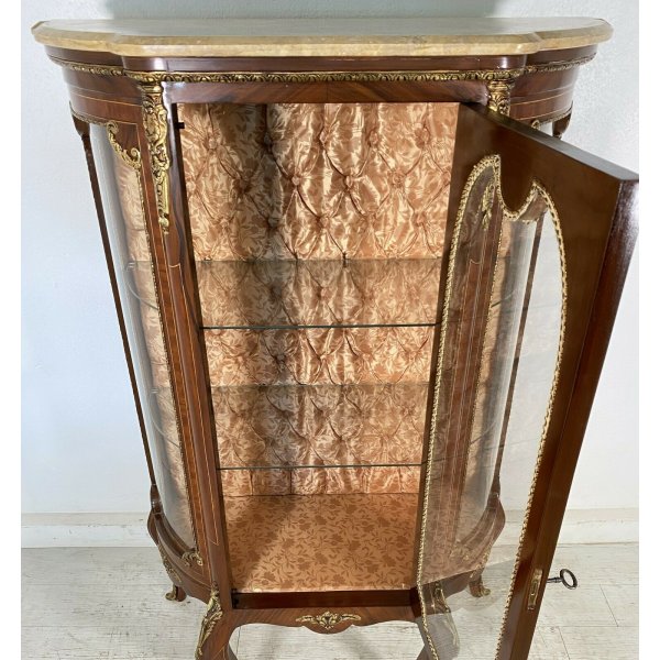 Fantastica antica vetrina in legno massello di noce dei primi del 1900 con 4 gambe, 2 ripiani, tutti vetri bombati, decori in ottone e un piano in marmo