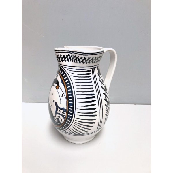 Stupenda brocca del '900, vintage in ceramica bianca intreramente dipinta a mano con smalto color blu e terra sul corpo è rappresentato il profilo di un pavone con un seme nel becco, classico soggeto delle decorazioni rinascimentali faentine. L' opera è numerata sulla base insieme al marchio d'attribuzione dipinto sotto smalto: 235 / Faenza / 1185 / Istituto d'Arte.