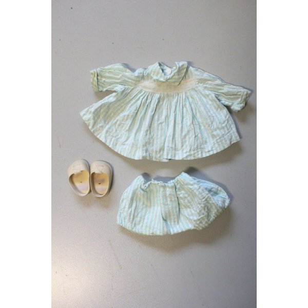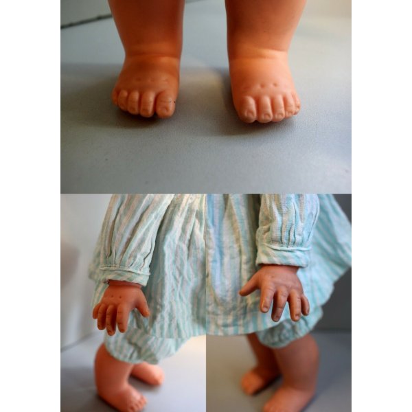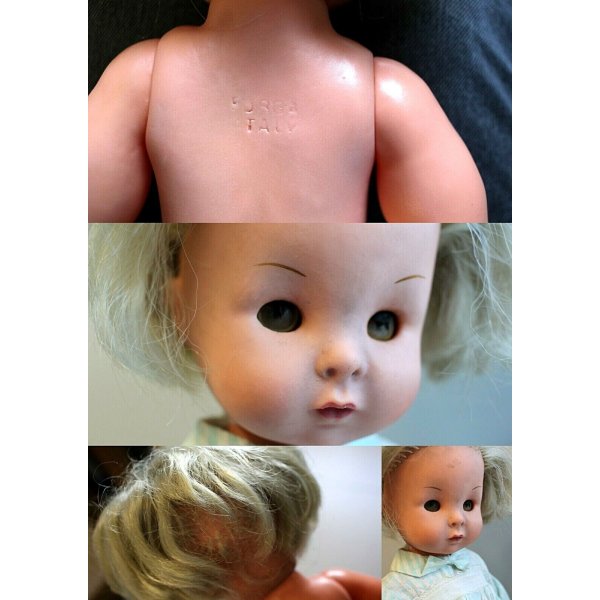 Bambola Vintage anni '60 "Carolina" Furga. Usata. Marchio sulla schiena e alla base della testa "Furga Italy". Indossa un pigiamino a righe verde acqua e le scarpine bianche. La bambola è completa di tutte le parti del corpo, gli occhi sono chiari, un po' opachi e cliccano, merita di essere ulteriormente pulita con prodotti specifici. I suoi vestiti sono giocati e presentano evidenti segni del tempo, valutabili dalle foto allegate all'inserzione: scuciture dei ganci di chiusura del vestitino, elastico lasco dei calzoncini, stropicciature. Le scarpine sono usurate.