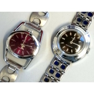 Delizioso lotto di 2 orologi da polso lady, vintage, Timex con quadrante color bronzo e cinturino acciaio e quadretti blu - Ok Breil con quadrante color magenta, movimento meccanico a carica manuale, entrambi funzionanti