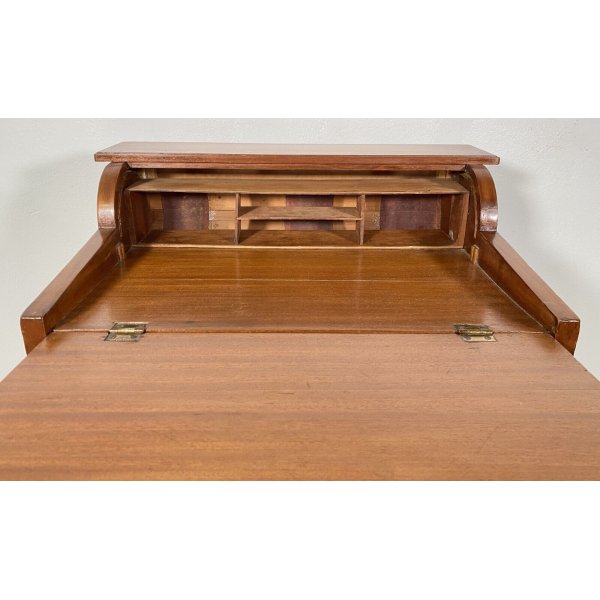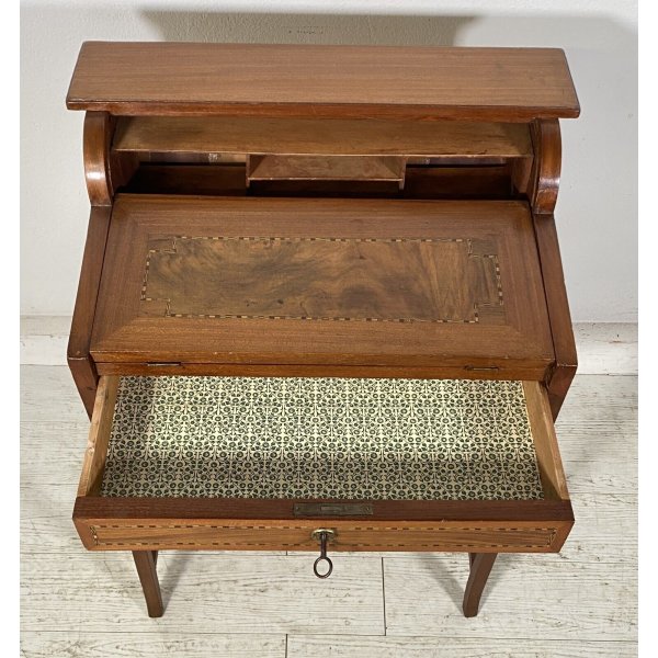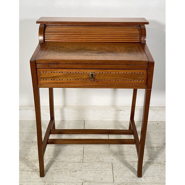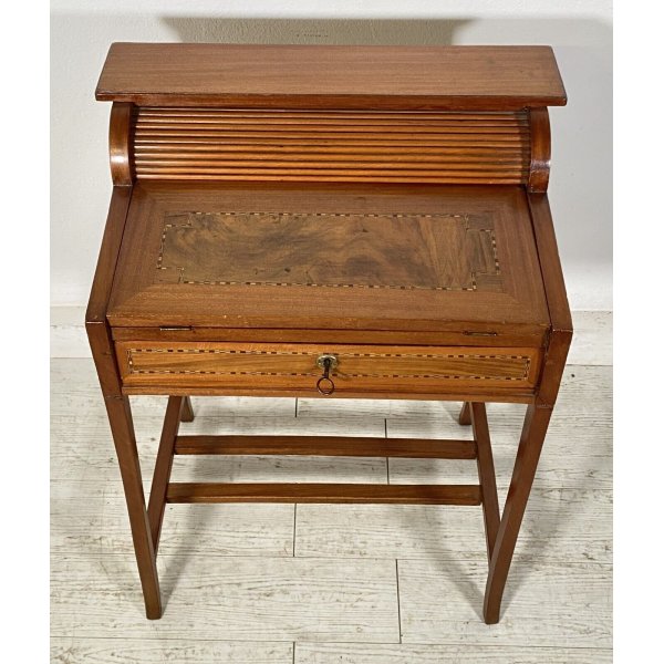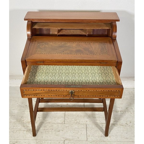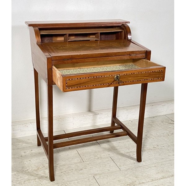 Fantastica scrivania antica inglese intarsiata del 1800 in legno di noce con 1 cassetto che aprendolo scorre aprendo anche la tapparella che a sua volta apre dei piccoli cassettini "segreti", presenta anche una ribalta che si appoggia al cassetto aperto