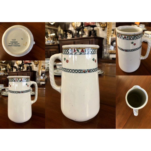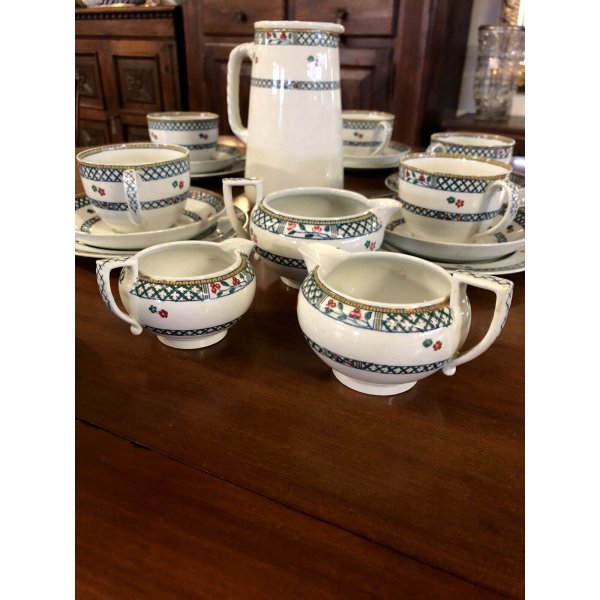 Stupendo antico servizio da tè o caffè, vintage inglese per 6 persone, realizzato in ceramica prodotto dalla Wedgwood, composto da 22 pezzi decorati con greca geometrico floreale multicolore su base bianca, Art Decò. Ogni pezzo presenta il marchio d'attribuzione sotto smalto "Lille Wedgwood Etruria England" - Importè D'Angleterre e, scritto a mano, il numero del pattern del decoro: A 5224(?). Composto da 6 tazzine da tè o caffè, 6 piattini, 6 piatti da dessert, 1 bricco piccolo per crema, 1 Bricco medio per panna, 1 Bricco grande per latte, 1 Bricco per acqua. In buono stato di conservazione, segnalo un'incollatura nella parte inferiore del manico del Bricco latte grande, visibile delle fotografie allegate all'inserzione (l'ultima). I piatti presentano leggeri segni del tempo e di utilizzo e leggeri aloni e usura del decoro nelle impugnature, particolari che ne confermano l'epoca e non ne compromettono l'utilizzo.
