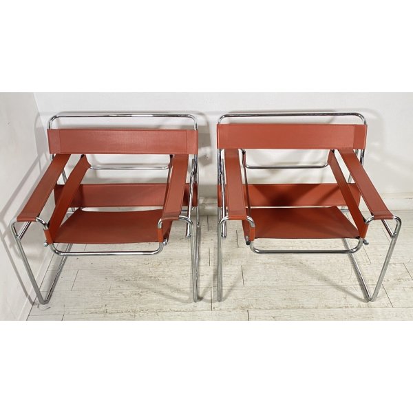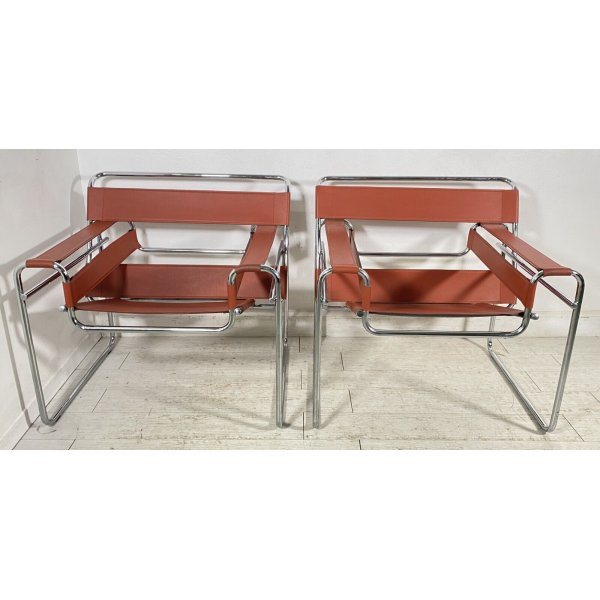 Fantastica coppia di poltrone riproduzioni del modello Wassily di Marcel Breuer, anni 80 in acciaio e pelle beige