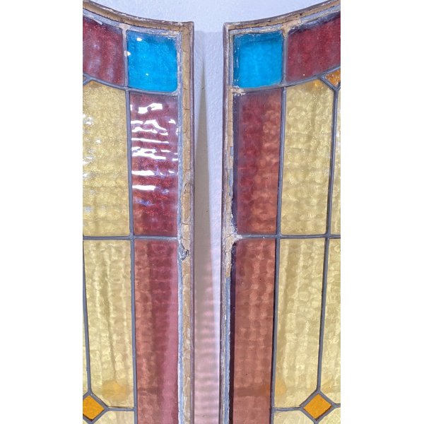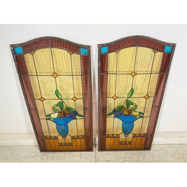 Fantastica coppia di vetrine per porte colorate con vasi di fiori e frutti degli anni 20/30 in stile liberty