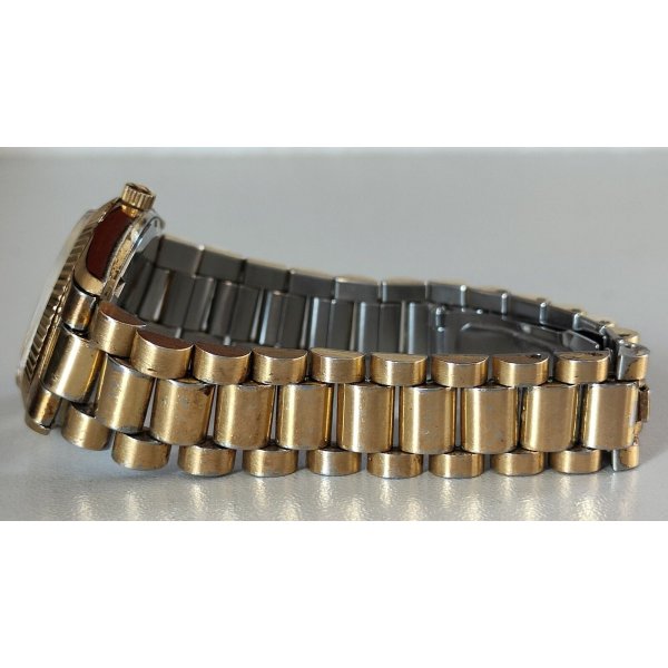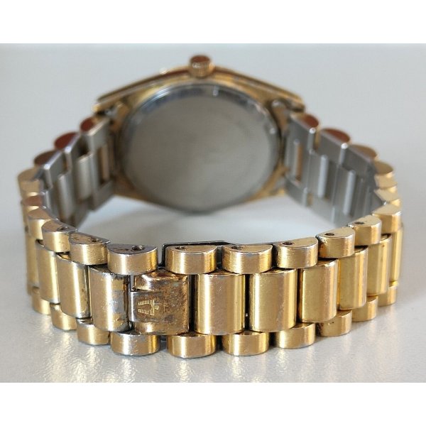 Delizioso ed elegante orologio da polso vintage, Bulova Calendar quartz, quadrante spazzolato color oro con indicatore della data alle ore 3, cassa e cinturino in acciaio dorato, cinturino e corona originale Bulova, funzionante