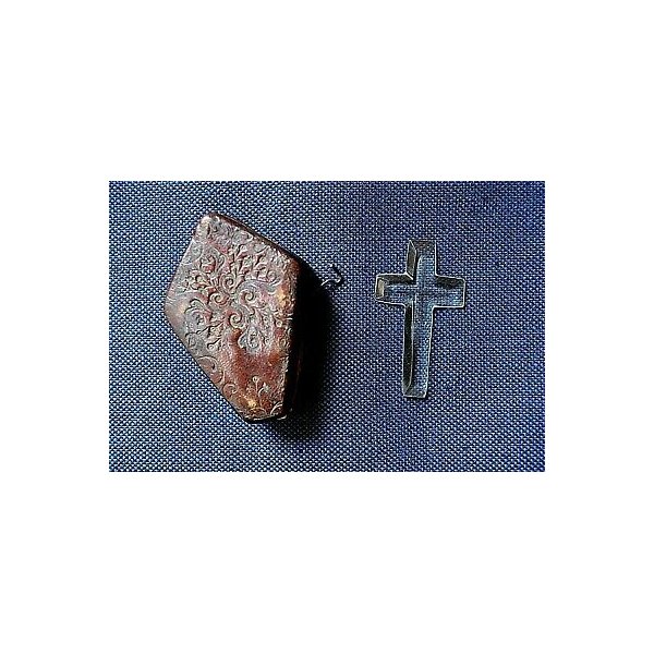 Ø TITOLO: Reliquia della Santa Croce accompagnata da rarissima bolla papale di epoca settecentesca. Il Crocifisso è in cristallo di rocca molato a mano, riposto all'interno di una custodia in cuoio impresso con decori floreali e volute, internamente rivestito in tessuto naturale e leggermente imbottito. Una sede sagomata composta da fili di vari materiali accoglie il crocifisso e la bolla papale.