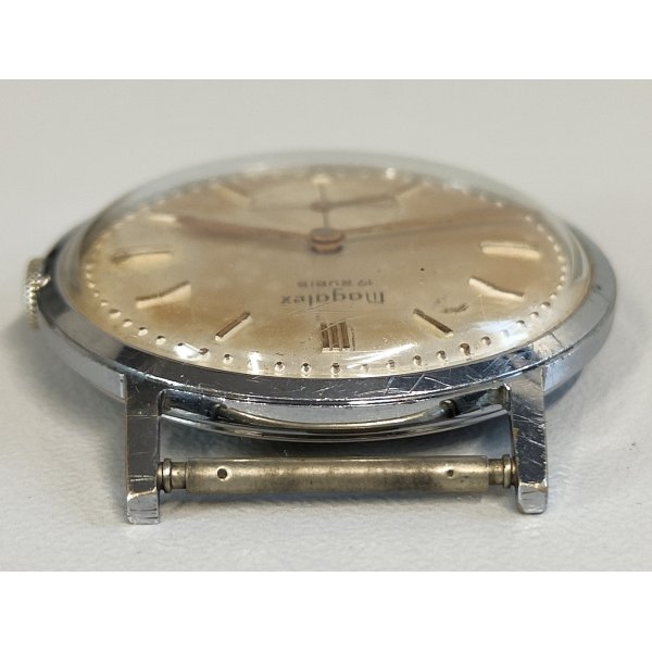 Megalex, cassa in metallo cromato, quadrante grigio chiaro con aloni champagne, indicatori ore a tacche e lunetta dei secondi alle ore 6, movimento meccanico a carica manuale, funzionante