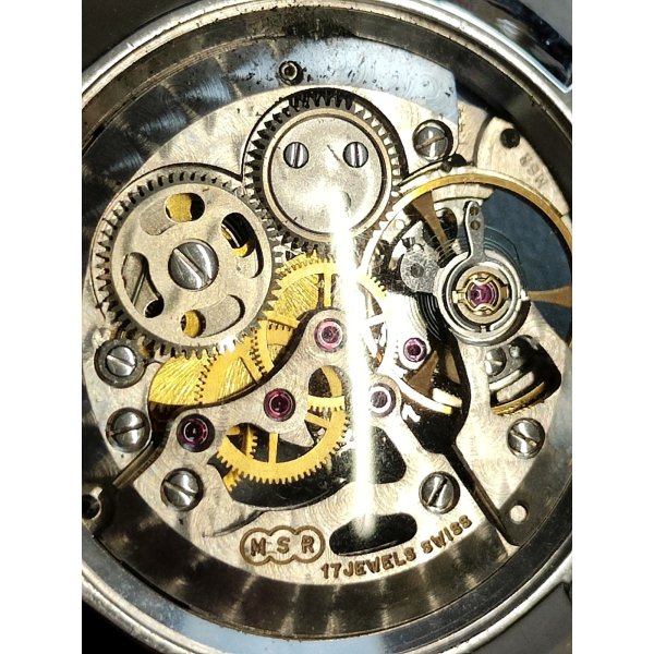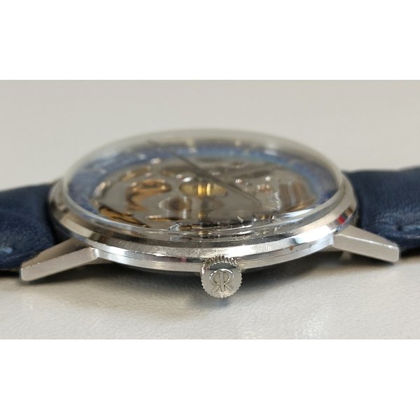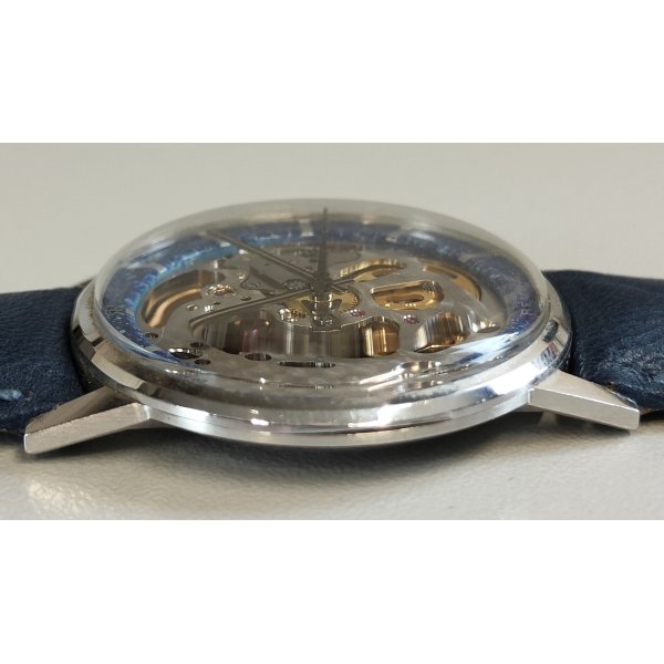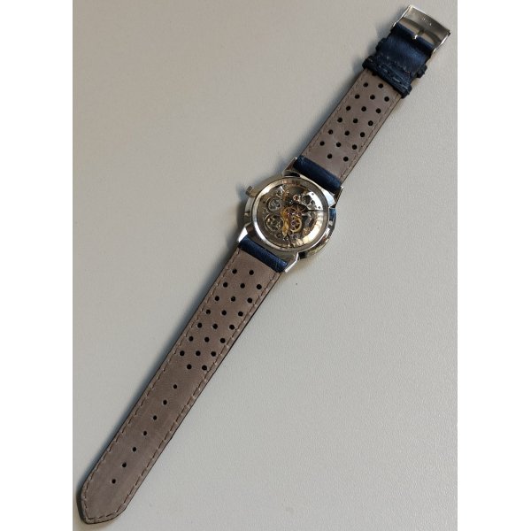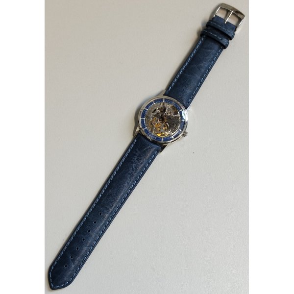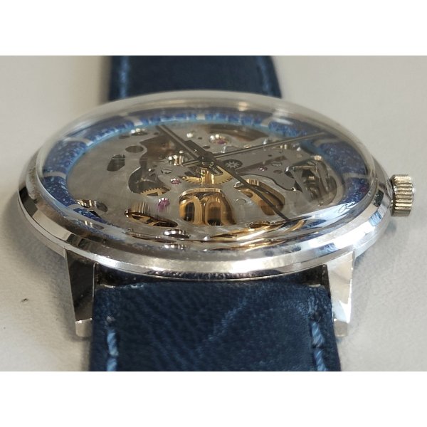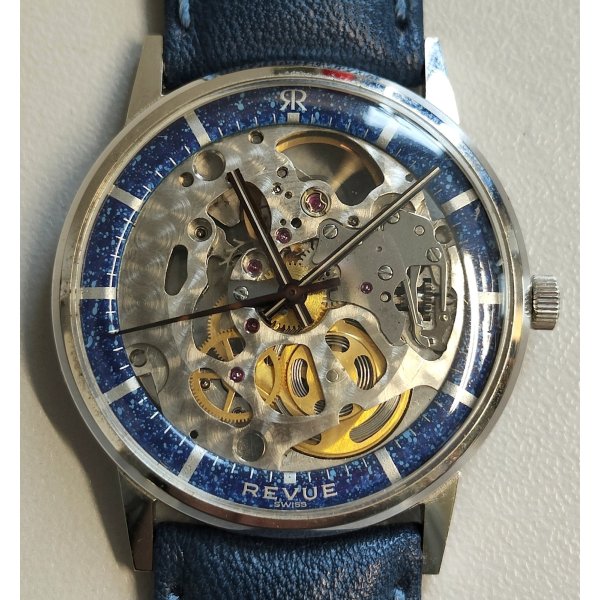 Bros di colore blu e corona tiges originale con marchio Revue, quadrante scheletrato con anello esterno delle ore di colore blu maculato, funzionante e già indossabile