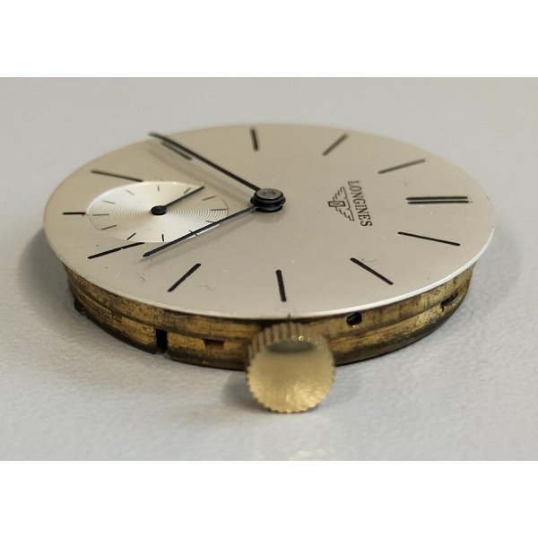 Movimento per orologio da polso, di altissima manifattura orologiaia, Longines 27.0, quadrante color argento con lunetta dei secondi alle ore 6, corona tiges non marchiata, lancette e marchi numerici colore nero, perfettamente funzionante