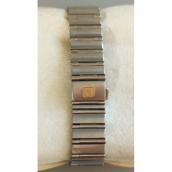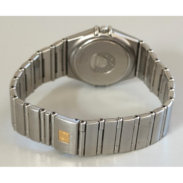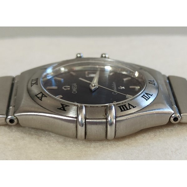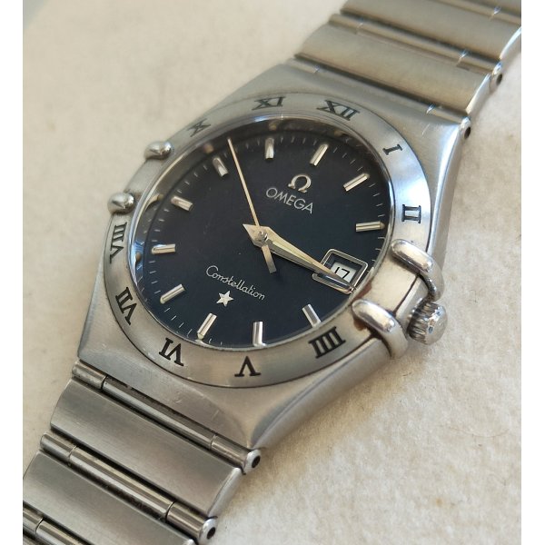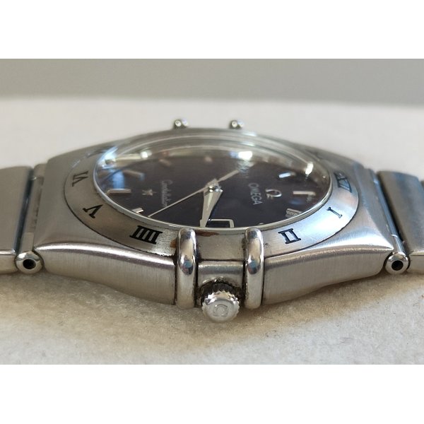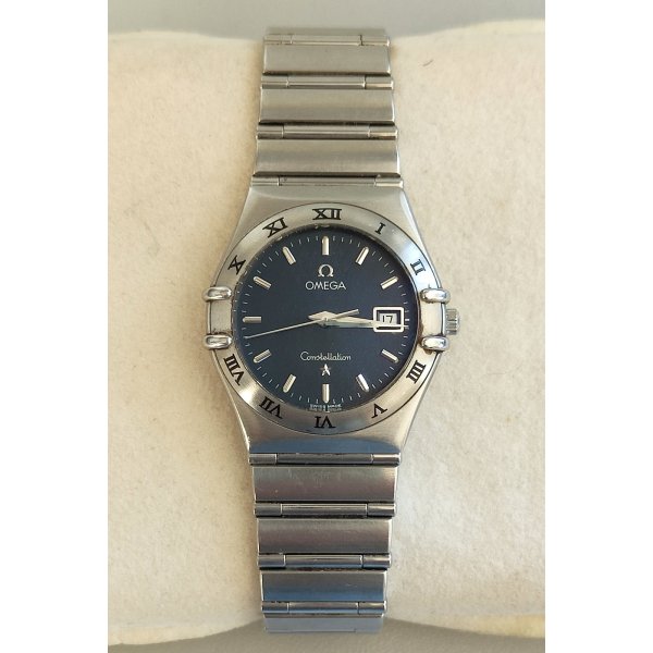 Omega Constellation, cassa e cinturino in acciaio, ghiera fissa con numeri romani in nero, quadrante color blu scuro con indicatori ore a tacche, datario alle ore 3, movimento al quarzo, funzionante