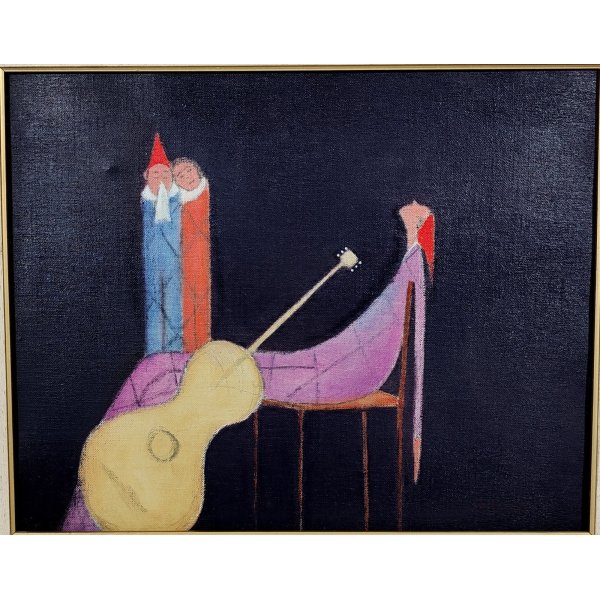 Bellissimo quadro dipinto ad olio su tela, raffigurante 3 personaggi Arlecchino ed intitolato "