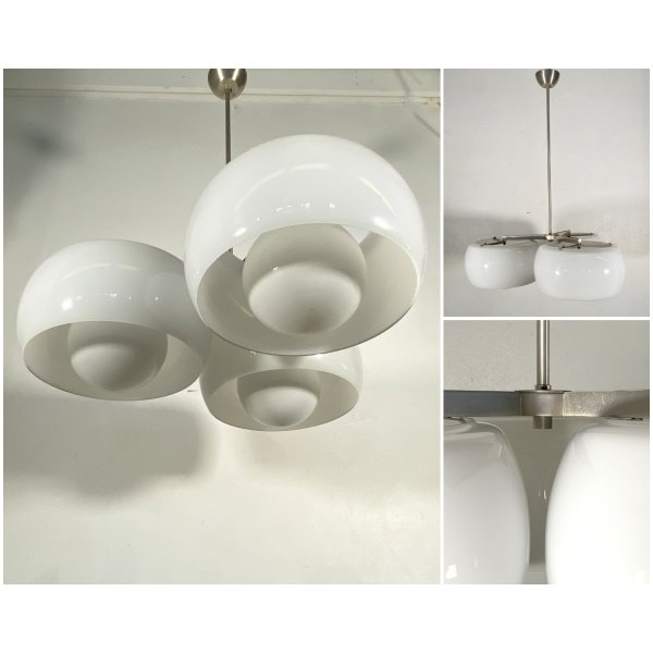 Stupendo lampadario modulare, composizione della lampada "Clinio" designata da Vico Magistretti nel 1967, ripetuta. Modello triclinio composto da 3 punti luce con struttura in ottone nichelato e diffusori in vetro opalino bianco, ognuno con sfera interna. Sospensione Icona del design modernista, in ottime condizioni, visibili dalle fotografie allegate