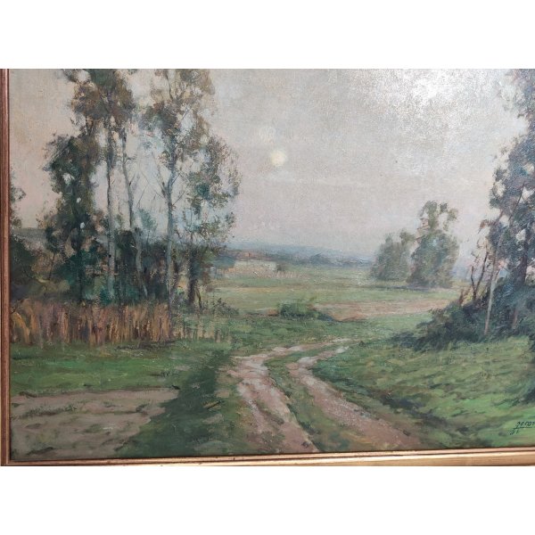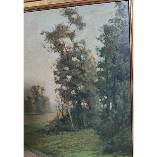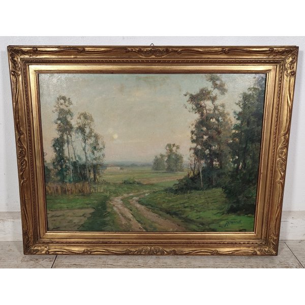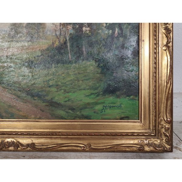 Gigi Comolli è noto per i suoi dipinti paesaggistici, la sua tecnica pittorica è caratterizzata da uno stile realistico, le luci e le ombre sono particolarmente ben studiate per dare profondità e volume alla composizione. L'immagine di questo paesaggio alberato e sentiero che si perde a vista d'occhio nei prati invita lo spettatore a immergersi nella natura e a contemplare la bellezza naturale. È un'opera che trasmette una sensazione di calma e serenità, offrendo un momento di riflessione e connessione con la natura. Dipinto firmato in basso a destra "Gigi Comolli" Luigi Comolli (1893-1976) artista quotato e presente in asta. Opera contenuta in una cornice lignea dorata