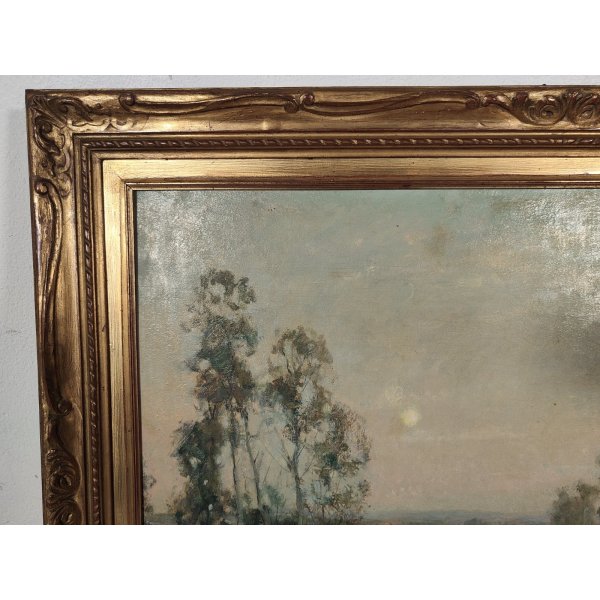 Stupendo dipinto olio su tavola rappresentante un paesaggio di campagna nel momento in cui il sole è sorto da poco.