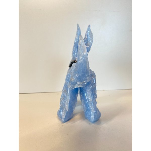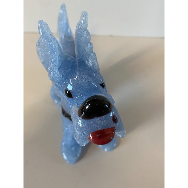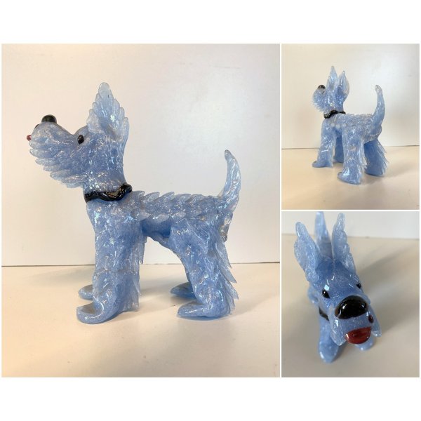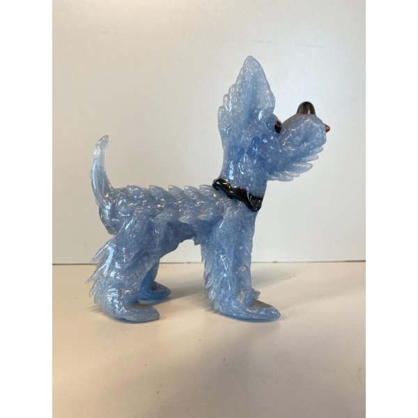 Meravigliosa scultura Art Decò, raffigurante un cane Scottish Terrier (15,5 cm/h), in vetro di Murano, pulegoso, blu trasparente, soffiato e lavorato a mano. Il design stilizzato è caratteristico di alcune produzioni vintage anni '40 associate al maestro vetraio Ercole Barovier, in ottimo stato conservativo. Oggetto da collezione