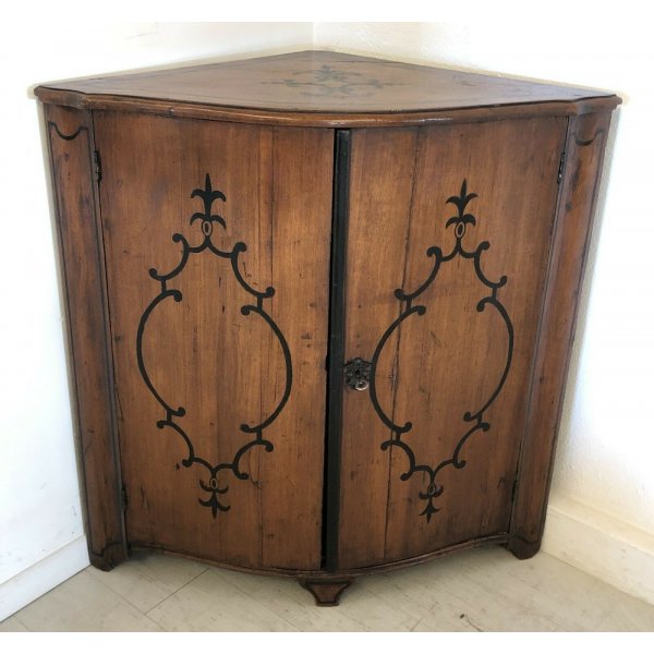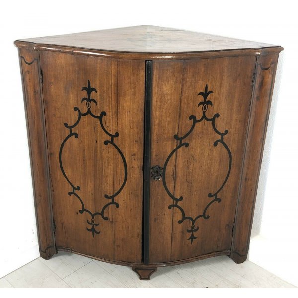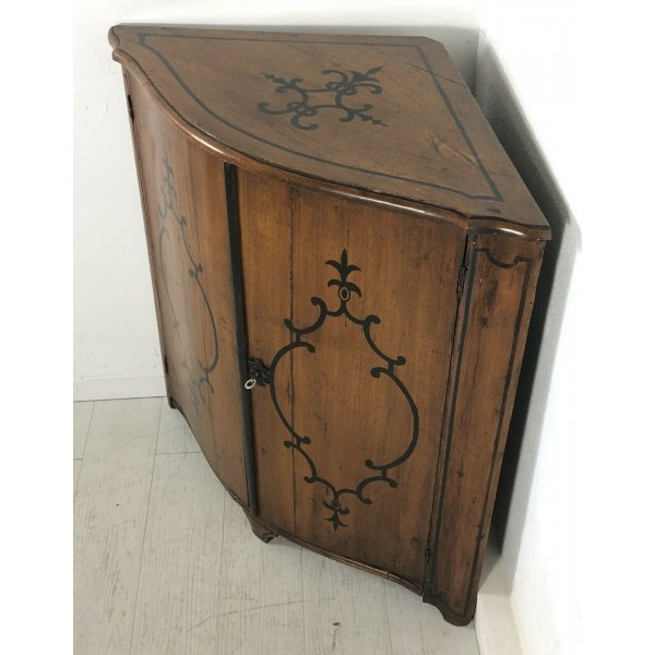 Fantastica angoliera Piemontese in legno di noce del 1800 finemente decorata con 2 ante e 2 ripiani, l'angoliera non forma un'angolo a 90 gradi ma di 100 gradi