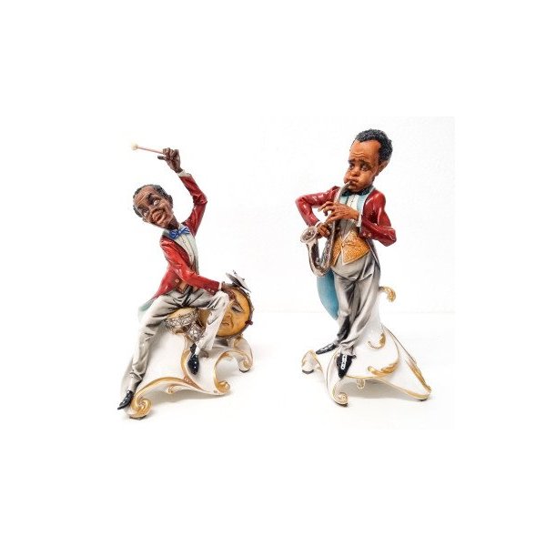 Le statuine sono in condizioni molto buone, come è facile constatare dalle foto allegate. Il saxofonista non presenta alcun difetto. Il batterista ha subito alcuni piccoli interventi di restauro (su un piede, sulla cassa e i piatti, sulle mani). Il mignolo destro è mancante. Valutare attraverso le foto.