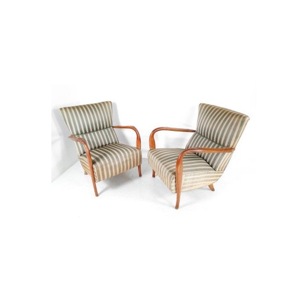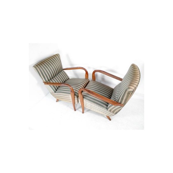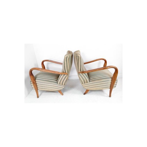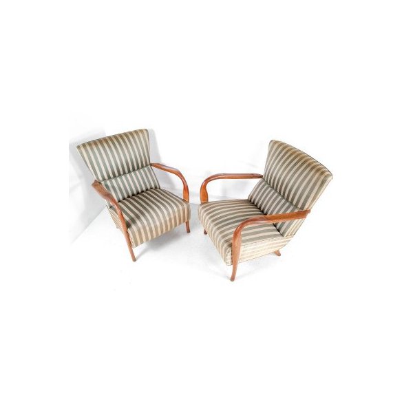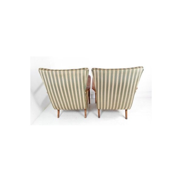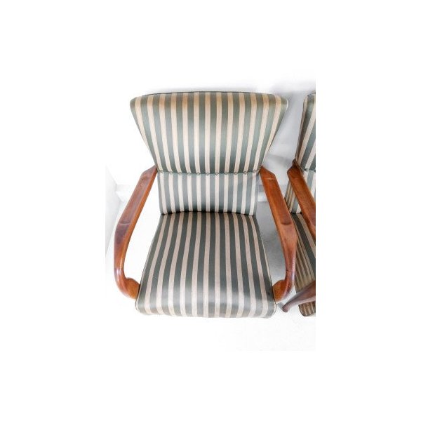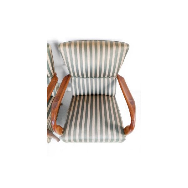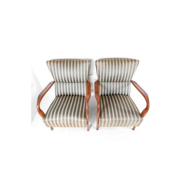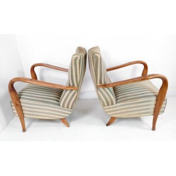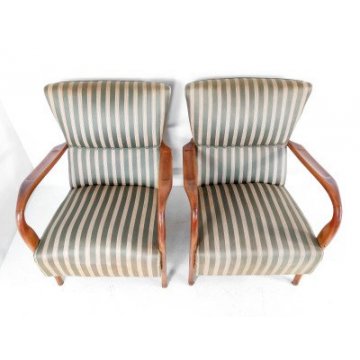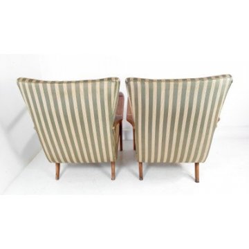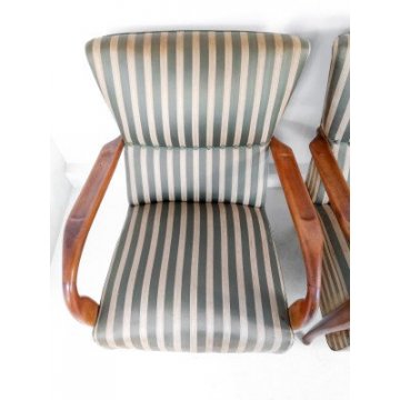 Le poltrone sono in condizioni molto buone, come è facile constatare dalle foto allegate. Riportano le normali tracce del tempo e dell'utilizzo, qualche segno sul legno, aloni sul tessuto. Valutare attraverso le foto.