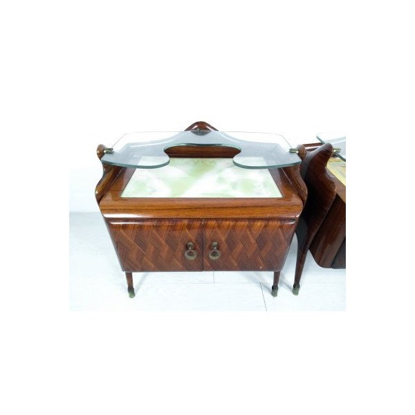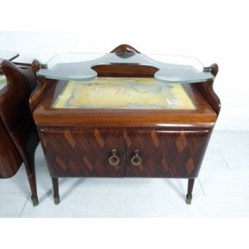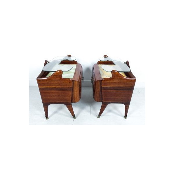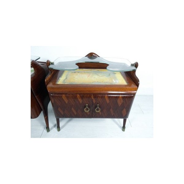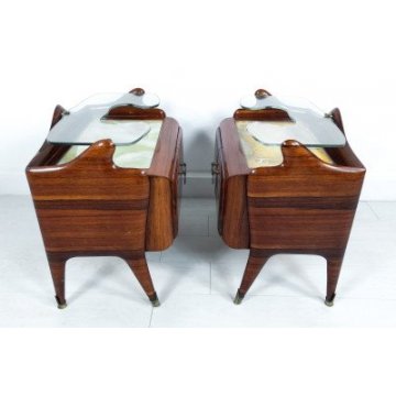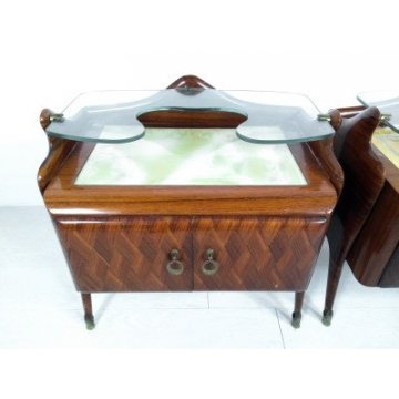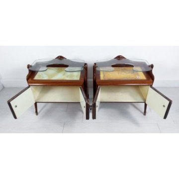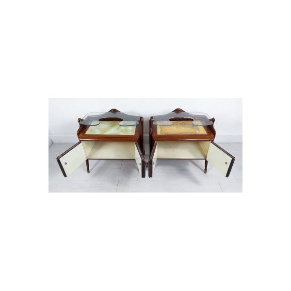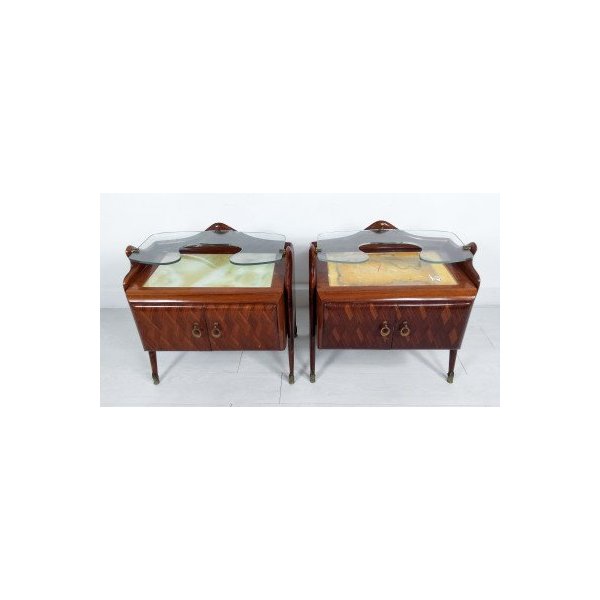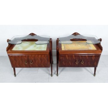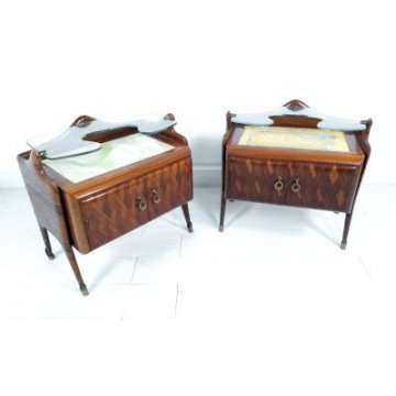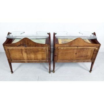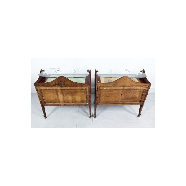 I comodini sono in condizioni molto buone, come è possibile constatare dalle foto allegate. Riportano qualche traccia del tempo sull'impiallacciatura, qualche piccola crepa e mancanza. Manca il vetro di uno dei due piani. Valutare attraverso le foto.