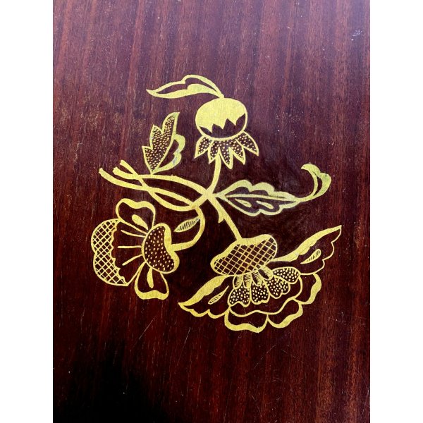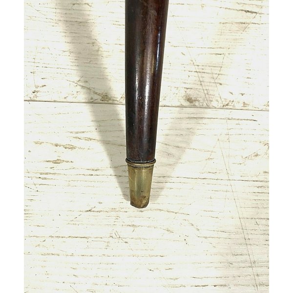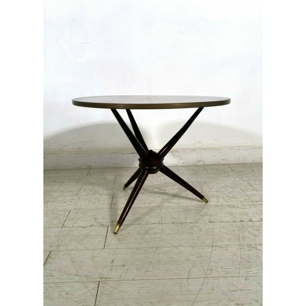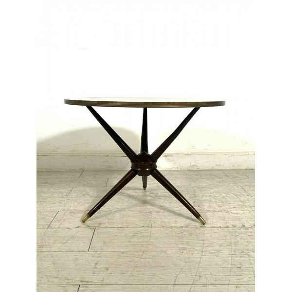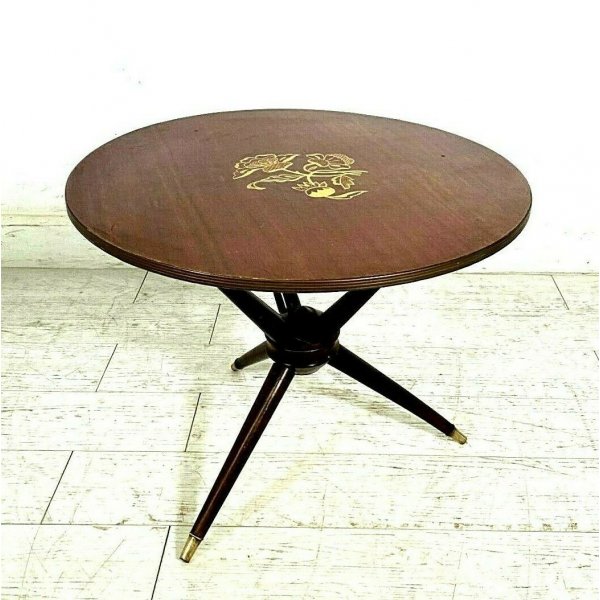 Fantastico tavolo vintage, mid century, rotondo basso in legno da caffé a una gamba e tre piedi con puntali in ottone. Il piano ha un decoro floreale, centrale dipinto color beige/crema.