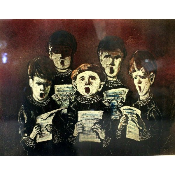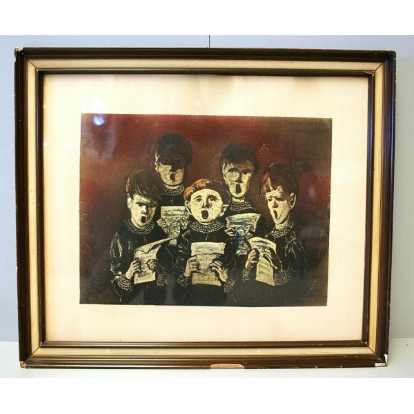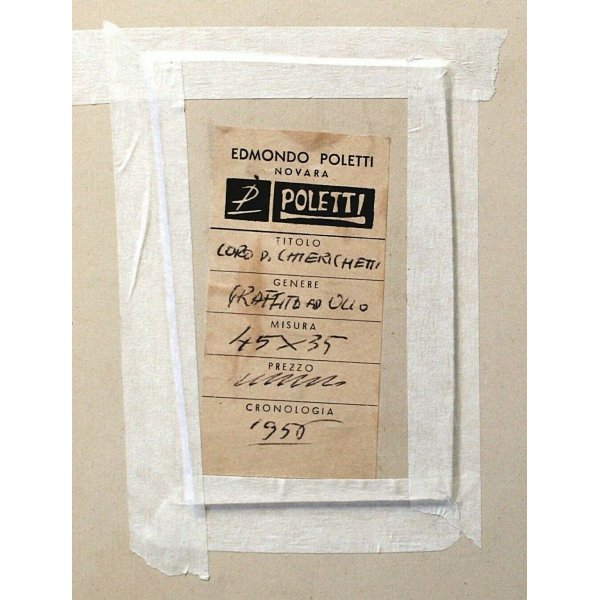 Stupendo dipinto, opera di Edmondo Poletti, graffito ad olio su carta titolato: "Coro di Chierichetti" di ottima fattura. L'opera è firmata e datata in basso a destra con un monogramma PE56 e contenuta in una cornice lignea coeva al quadro con vetro protettivo, sul retro è presente un cartiglio dello studio di Edmondo Poletti con titolo, dimensioni e data. Edmondo Poletti è un noto artista novarese, quotato e presente in asta con numerose opere, guarda nel nostro negozio ebay per trovarne altre.
