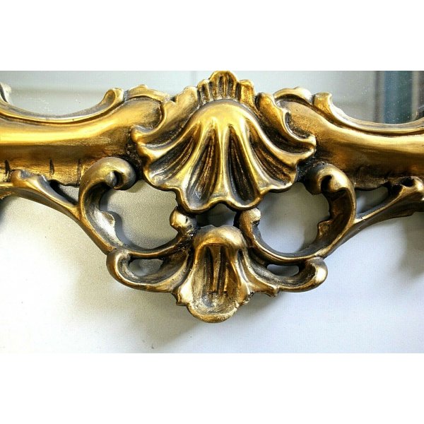 Stupenda, antica, grande specchiera sagomata, barocca. Con cornice lignea intagliata, traforata e dorata, con decori in forma di cornucopie con boccioli, fiori, foglie, riccioli e volute. Complemento d'arredo, vintage, scenografico, adatto ad ogni tipo di ambiente