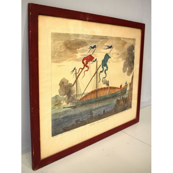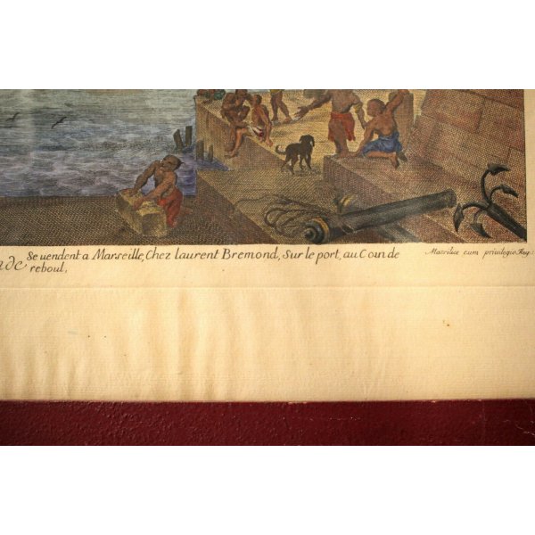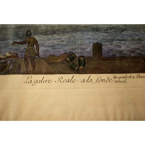 Stupenda antica stampa, litografia dal titolo "La Galere Reale a la, fonde" colorata a mano rappresentante l'immagine di una nave reale nel porto (c. 1690). Incisione di Claude Randon.
