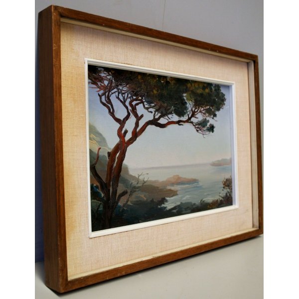 Suggestivo dipinto olio su cartone pressato, rappresentante un paesaggio marino, in primo piano, un pino marittimo con il suo fusto inclinato e contorto, incornicia la linea dell'orizzonte. L'opera è firmata in basso a destra F. Daniele, datata sul retro "1963" ed è contenuta in una cornice lignea con passepartout in tela grezza