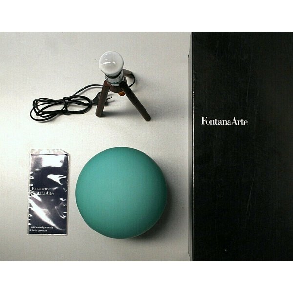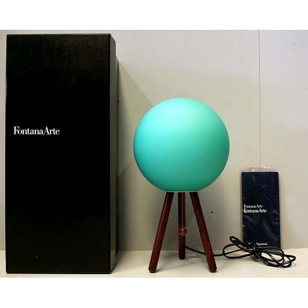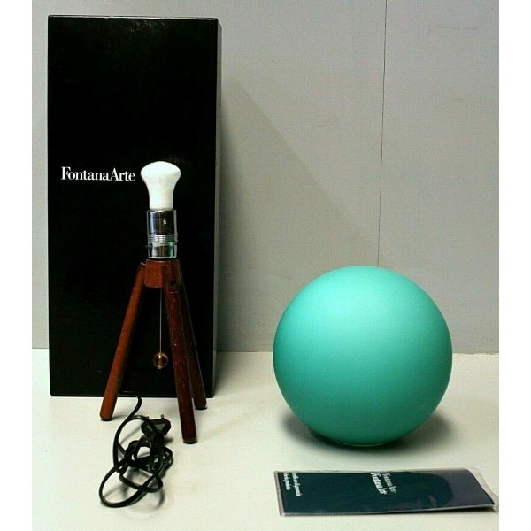 Fantastica, lampada tavolo vintage, rara, funzionante, disegnata da Daniela Puppa per Fontana Arte nel 1992. E' caratterizzata da un paralume in vetro smerigliato color verde acqua marina su una base a treppiede in faggio e una catena di trazione in vetro ambrato. La lampada è completa di la scatola originale che presenta leggeri segni del tempo su di un angolo del coperchio e libretto certificato di provenienza.