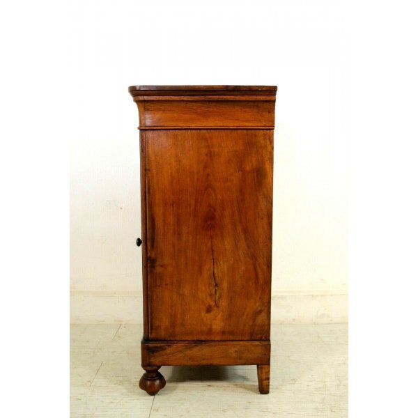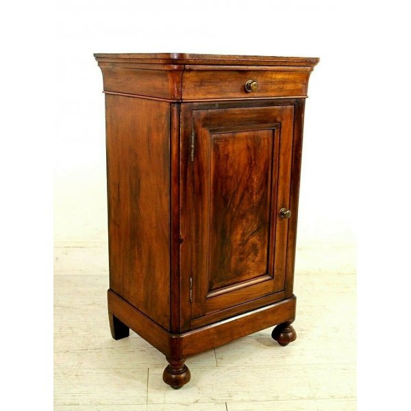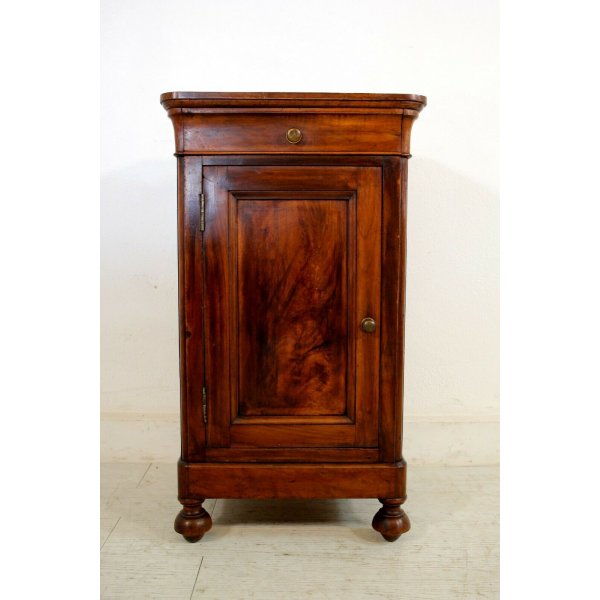 Incantevole comodino cappuccino in legno massello di noce del 1800 con un cassetto nella fascia sagomata a gola di tulipano e a un'anta, le gambe frontali sono a cipolla, quelle posteriori diritte.