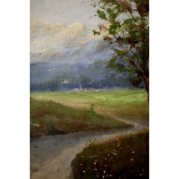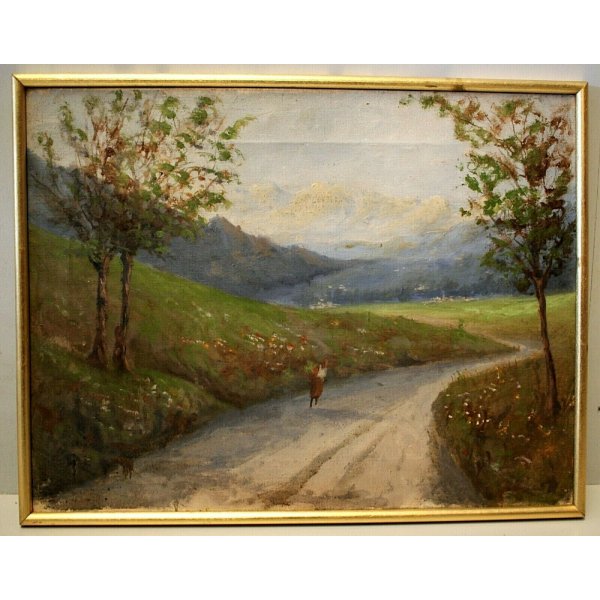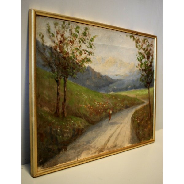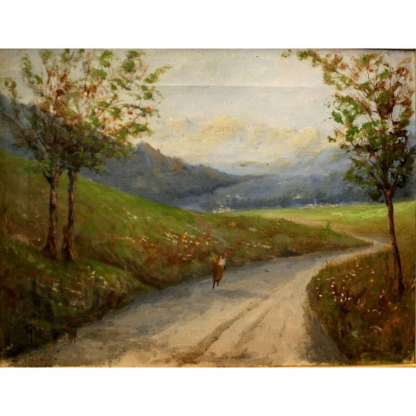 Delizioso piccolo quadro, dipinto ad olio su tela, rappresentante una scena di vita quotidiana ambientata in un paesaggio montano: una strada ritagliata tra i prati fioriti, l'alternanza di toni chiari e scuri permette di creare l'impressione di profondità, sullo sfondo il profilo delle montagne innevate punteggiate da piccoli centri abitati. Una donna ritorna a casa con un fascio di erba tra le braccia per gli animali. L'opera non presenta firma ed è contenuta in una semplice e lineare cornice lignea stondata e dorata.