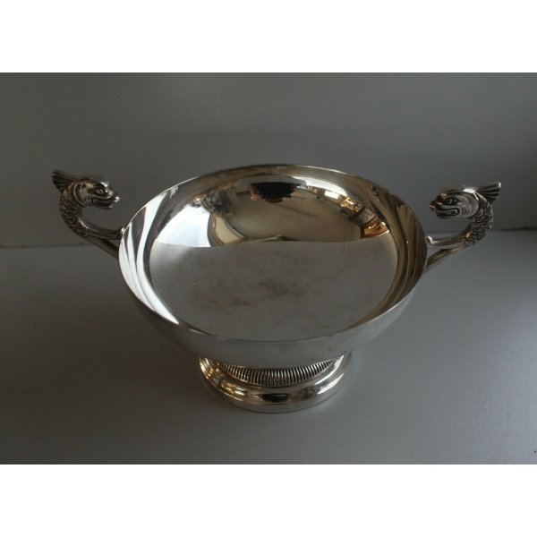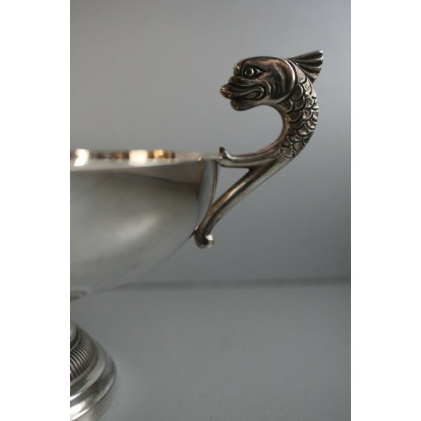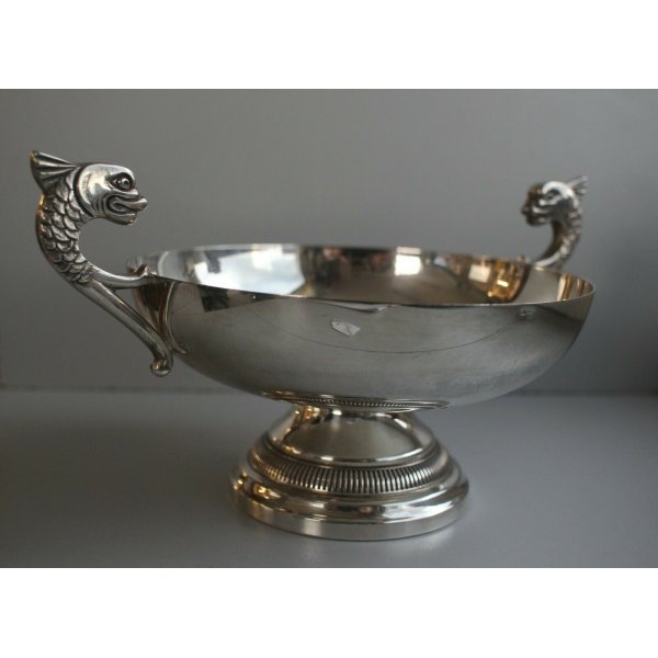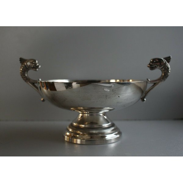 Stupenda piccola alzata Vittoriana, Silverplated, rotonda con decoro neoclassico sul piede e prese in forma di tritone, punzonata sul bordo lateralmente (n°15 e una stella)