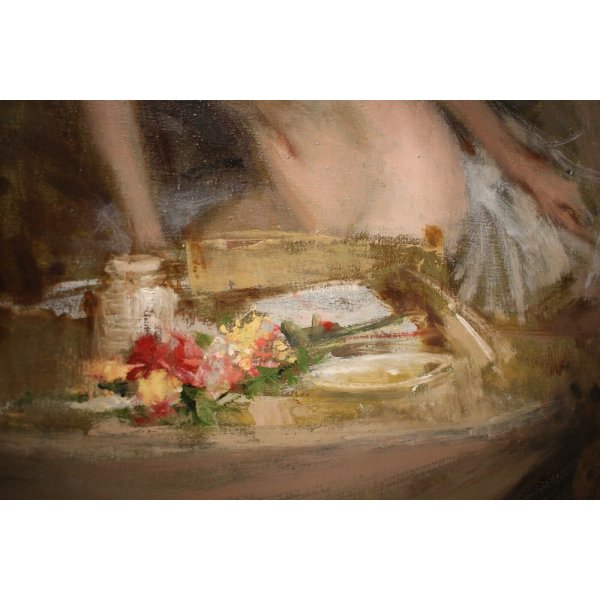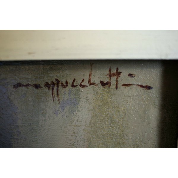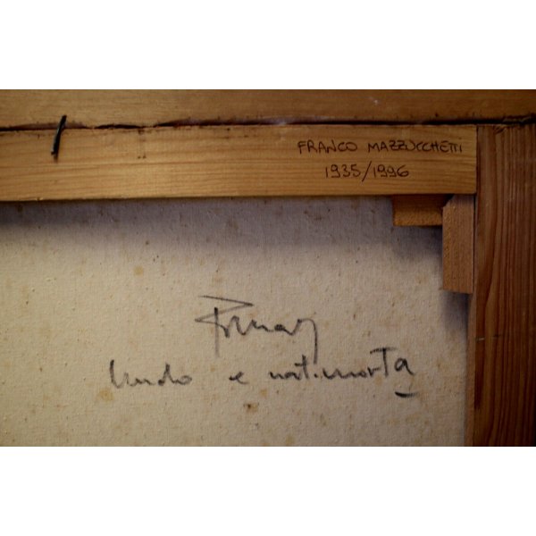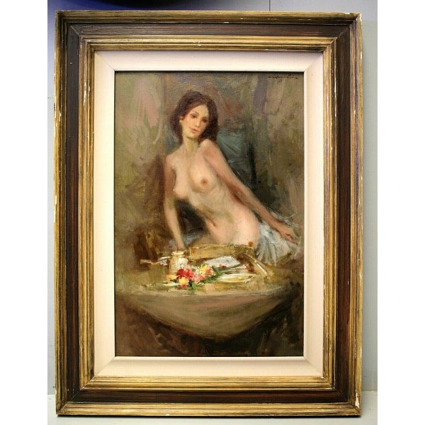 Incantevole quadro dipinto ad olio su tela " Nudo donna e natura morta" L'opera e firmata in alto a destra "Mazzucchetti" e titolata sul retro. Franco Mazzucchetti è un artista quotato e presente in asta con altre opere. L' opera e contenuta in una cornice gessata dalla finitura ricercata, volutamente anticata con passepartout ligneo color panna.