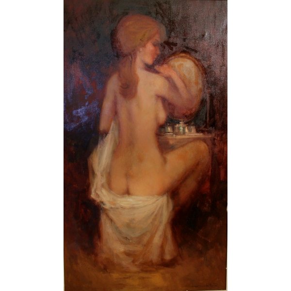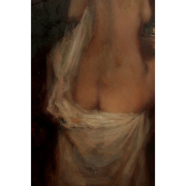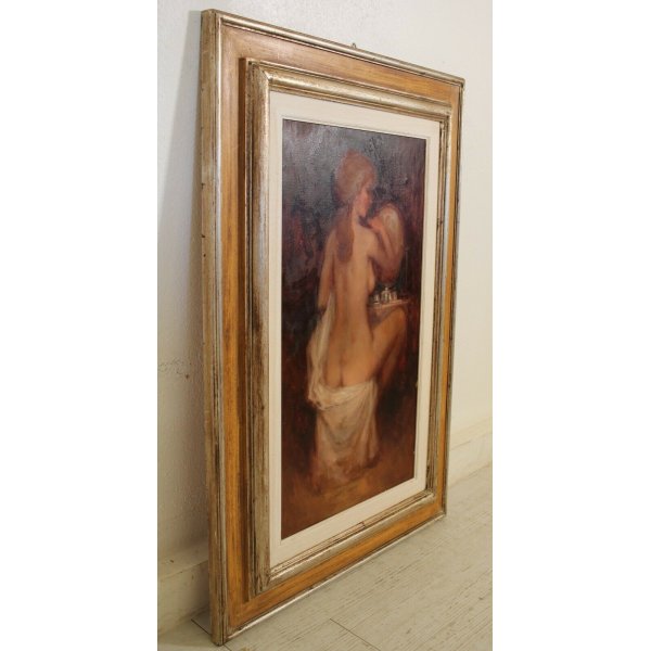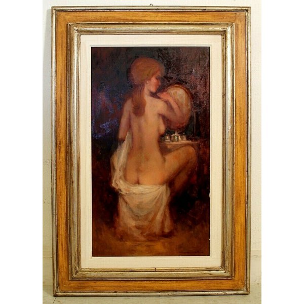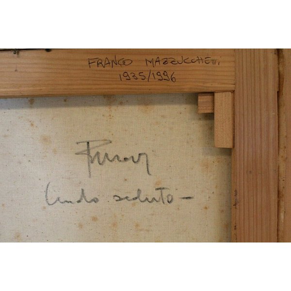 Incantevole quadro dipinto ad olio su tela, titolato sul retro "Nudo seduto". L'opera e firmata in basso a destra "Mazzucchetti". Franco Mazzucchetti è un artista quotato e presente in asta con altre opere. Il dipinto è contenuto in una cornice gessata dalla finitura ricercata, volutamente anticata con passepartout ligneo color panna.