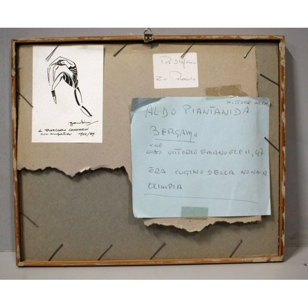 Composizione con tazza di caffè brocca e pacchetto di sigarette. Abitudine o piacere, risveglio o momento di relax "classico italiano". Il tutto contenuto in una cornice lignea essenziale, con passepartout in tela grezza e vetro protettivo.L'opera non presenta firma, sul retro ci sonoinformazioni sull'artista Aldo Piantanida, architetto e pittore, attivo in Bergamo nella prima metà del '900.
