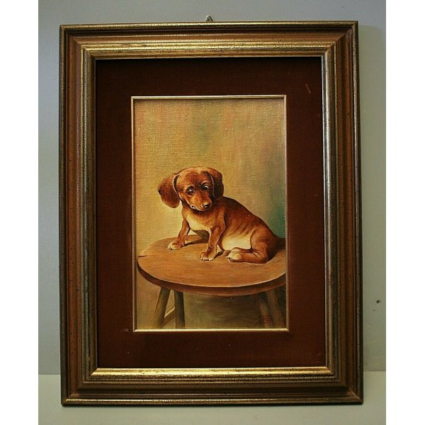 Grazioso ritratto di cagnolino bassotto dal pelo corto, dipinto di ottima fattura, molto espressivo, firmato in basso a destra L. Bacci. Il tutto è contenuto in una cornice lignea ornata e dorata con passepartout in tela marrone.