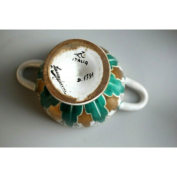 Fantastico vaso, coppa in ceramica smaltata decorata a mano in verde e oro zecchino, opera di Ugo Zaccagnini. Numerato sulla base D.1791 firmato e con il logo di attribuzione.