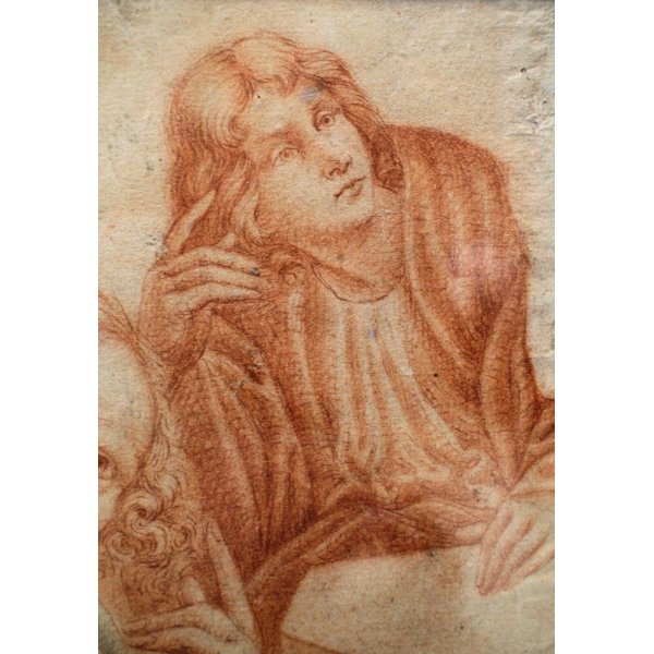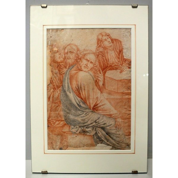 Stupendo antico disegno preparatorio, dettaglio dei particolari anatomici di un gruppo di personaggi di un dipinto o affresco. Realizzato con sanguigna su carta spolvero, l'opera non presenta firma ed è contenuta in una semplice e lineare cornice a giorno con vetro protettivo. Non sono un'esperta se riconoscete la scena, forse biblica, rappresentata... Please, help me!,