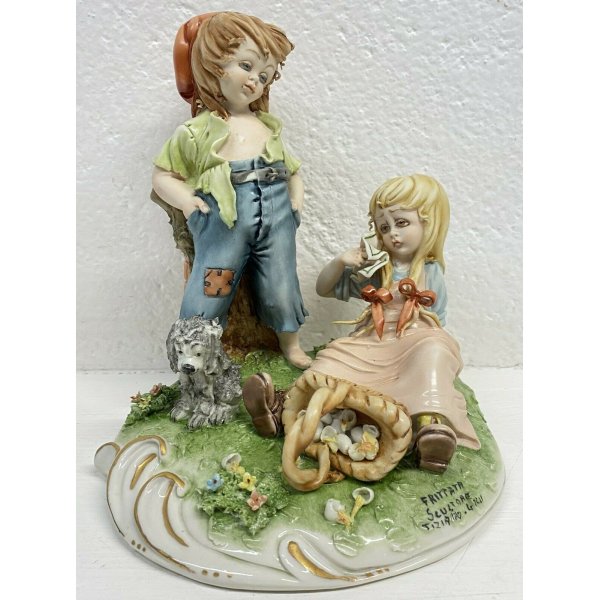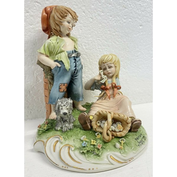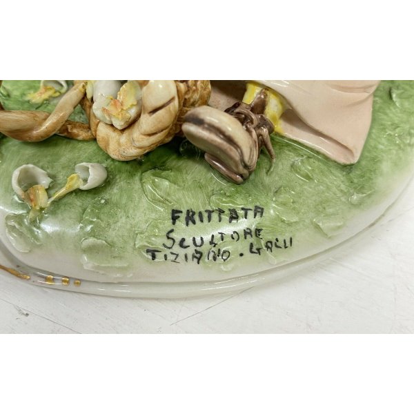 Fantastica scultura in porcellana di Tiziano Galli chiamata "Frittata" degli anni 40/50, raffigurante 2 bambini, 1 cane e un cesto di uova caduto per terra con delle uova rotte