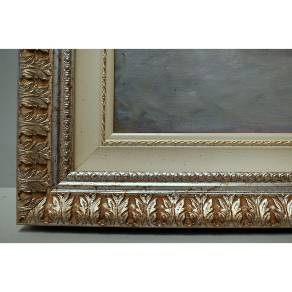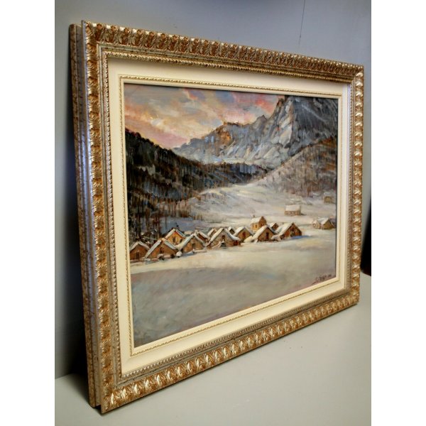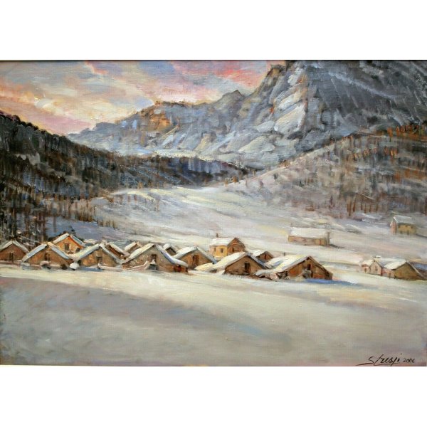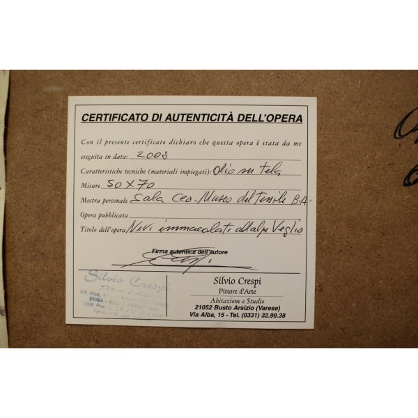 Suggestivo dipinto olio su tela applicata su tavola, rappresentante un paesaggio alpino,"nevi immacolate all' Alpe Veglia", il profilo di un piccolo paese sotto una coltre di neve si staglia sullo sfondo delle montagne illuminate dal sole, nel cielo le nuvole con i riflessi rossi del tramonto. L'opera è firmata in basso a destra "Silvio Crespi" artista quotato e presente in asta, ed è contenuta in una cornice ornata con greca in foglie d'acanto, argentata e dorata con passepartout ligneo. Sul retro è presente un cartiglio che certifica l'autenticità dell' opera - dimensioni - data - titolo e autentica scritta per mano dell'artista