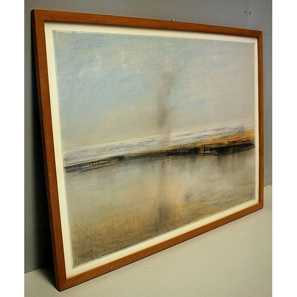 Disegno a pastello su carta, rappresentante una marina, firmata, titolata e datata in basso a sinistra: A. Alberti - "pescara" 1969. Aldo Alberti è un artista noto in Busto Arsizio, quotato e presente in asta. L'opera è contenuta in una cornice essenziale, lignea con vetro protettivo
