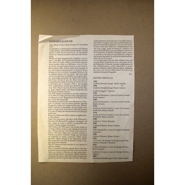 Autore: Dipinto firmato in basso a sinistra Aldo Alberti (Busto Arsizio, 21 novembre 1912 – Busto Arsizio, 22 gennaio 2014). Fin da giovane Alberti manifestava un'inclinazione al disegno che venne subito notata dagli artisti della sua città natale che, con le loro influenze, contribuirono alla sua crescita artista e personale[1]. Rifiutatosi si iscriversi all'Accademia di belle arti di Brera, si fece largo nel mondo dell'arte da autodidatta frequentando le biblioteche d'arte e gli studi di altri pittori. (...) Il suo esordio risale agli anni 1930, quando prese parte ad alcune mostre collettive organizzate dal sindacato fascista. Nel 1935 lasciò Busto Arsizio per prendere parte alla seconda guerra mondiale, durante la quale fu fatto prigioniero e trasferito in Germania, nel campo di concentramento di Schongau. Durante il periodo della carcerazione passava il suo tempo disegnando per trovare consolazione alle sofferenze della prigionia. Tornato a casa nel 1945 si dedicò interamente alla pittura e continuò a dipingere per il resto della sua vita. wikipedia