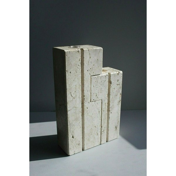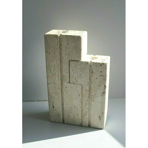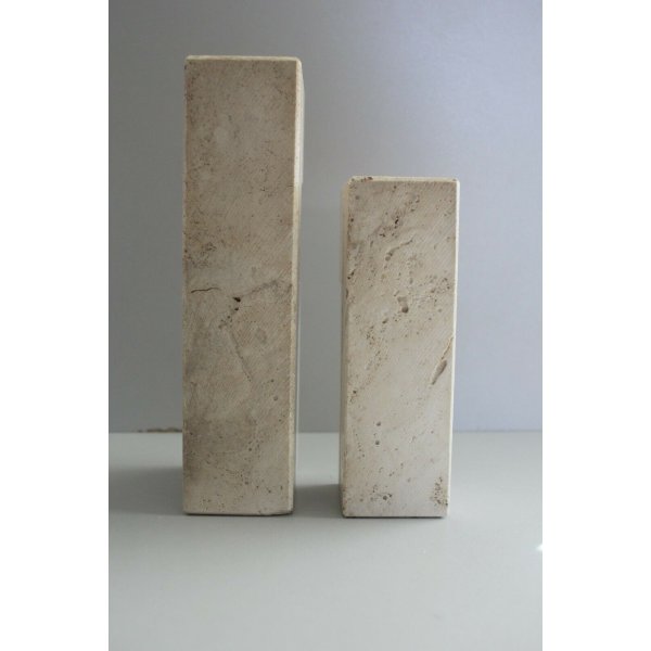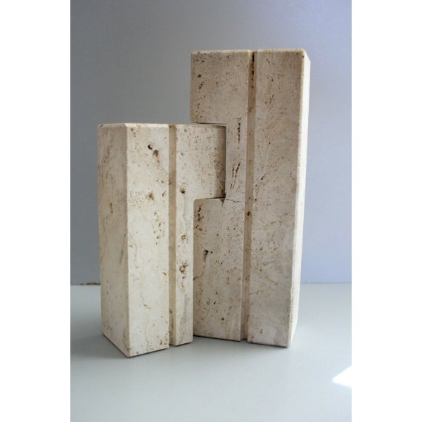 Bellissima coppia di sculture, in forma di parallelepipedi in travertino. Non presenta marchio di attribuzione, per forma e materiale il design è riferibile ai Fratelli Mannelli per Travertino di Rapolano, anni '60, di forte spessore, utilizzabili come oggetti decorativi, vasi monofiore, candelieri, fermalibri. Di ottima fattura in materiale pregiato.