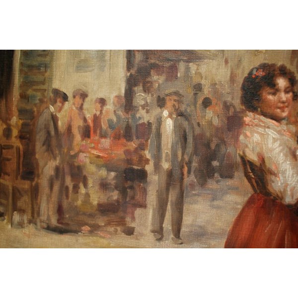 Stupendo dipino olio su tela rappresentante una scena di genere con figure. La veduta di un mercato animato a Napoli, dipinto in plain air, di ispirazione impressionista, in primo piano le fioraie sistemano e mostrano i loro fiori, sullo sfondo uomini fuori dal caffè chiaccherano, un uomo si avvicina alla bancarella e dialoga con la fioraia. Opera, di ottima fattura dalle pennellate brevi decise e materiche, firmata in basso a destra in rosso ma di difficile interpretazione: A. De March.(?) Se riconoscete l'artista o l'opera please help me! Il dipinto è contenuto in una elegante cornice lignea ornata con lumeggiature oro e passepartout.