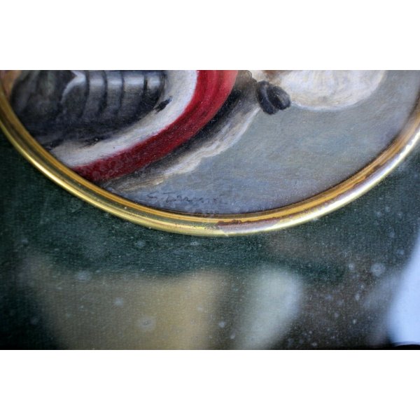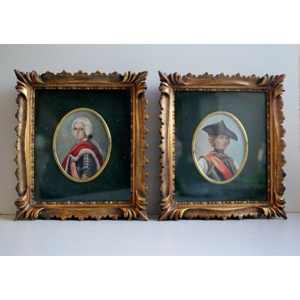 Meravigliosa coppia di dipinti olio, miniature. Ritratti ovali di un gentiluomo e di una gentildonna in armatura. Rara rappresentazione di donna in uniforme, di ottima fattura firmati all'interno dell'ovale ma di difficile interpretazione "G.Tarenzi". Le opere sono contenute in eleganti cornici ornate, dorate con passepartout in velluto verde scuro, l' ovale è bordato da un profilo in metallo dorato, con vetro protettivo. I due quadri hanno un certificato/garanzia: seggetto eseguito esclusivamente a mano, E. Vanni dipinti artistici - Milano - Via Solari 23.