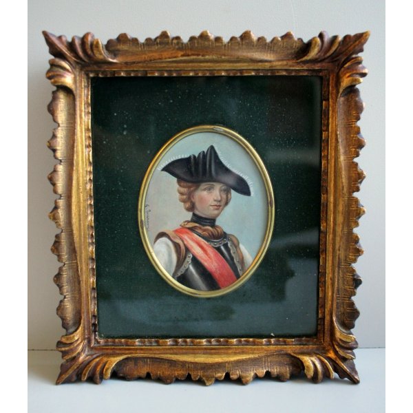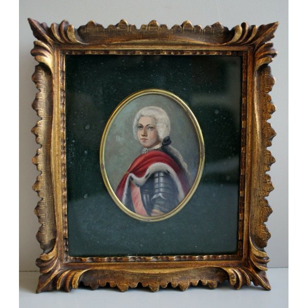 Condizioni: Buone nell'insieme. Leggeri segni del tempo, punti di umidità sul valluto del passepartout e alcune piccole mancanze di doratura sulla cornice del gentiluomo, visibili dalle foto allegate.