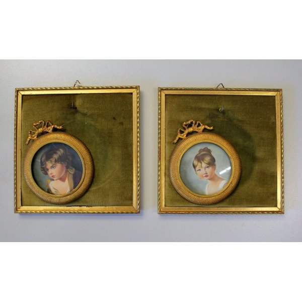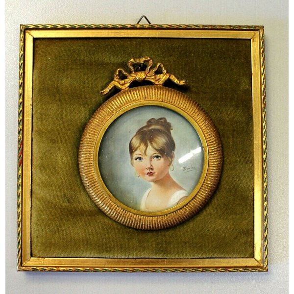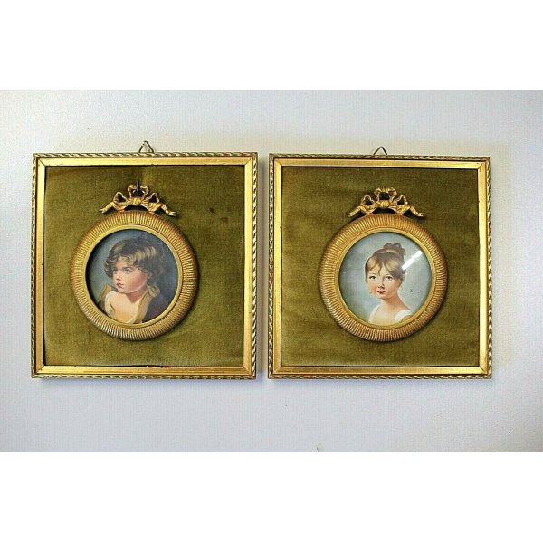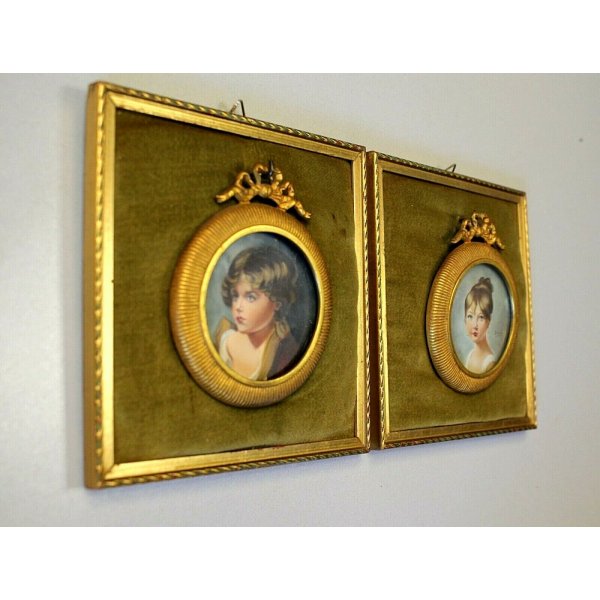 Meravigliosa coppia miniature dipinte ad olio su rame "ramino" del xx sec. Ritratti contenuti in medaglioni liberty, cornici d'ottone, con vetro protettivo, appesi su di una cornice quadrata ornata e dorata con imbottitura rivestita in velluto verde. Opere firmate "Dorian" sul lato sinistro il ritratto della bimba e su quello destro il ritratto del bimbo..