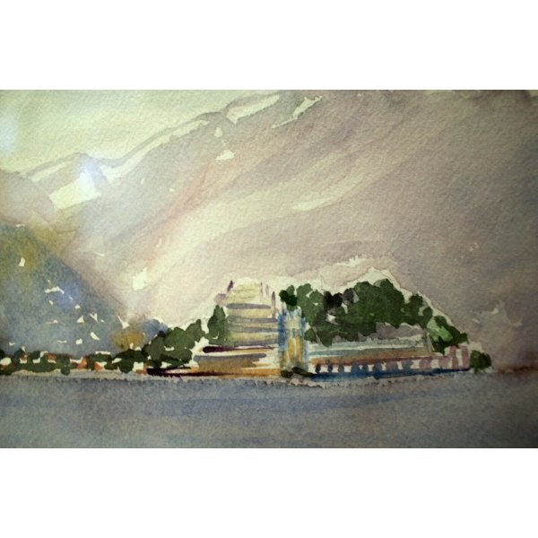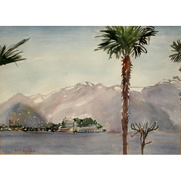 Raffinato acquerello rappresentante una veduta dell'Isola Bella sul Lago Maggiore vista da Stresa. L'opera di ottima resa artistica e cromatica, l'isola si staglia sullo sfondo del profilo delle Alpi. Il dipinto, si presenta in buono stato di conservazione, è firmato in basso a sinistra ma di difficile lettura. Il tutto contenuto in una minimale cornice in legno bianca, con passepartout in cartone pressato e vetro protettivo.
