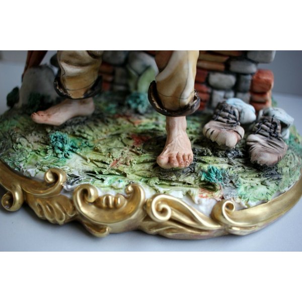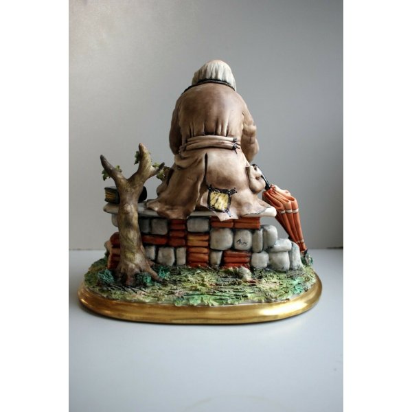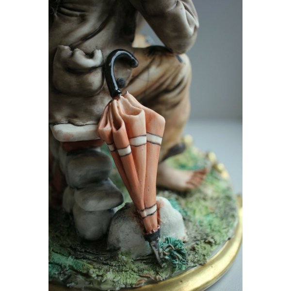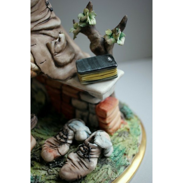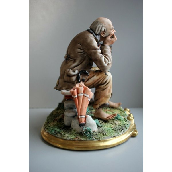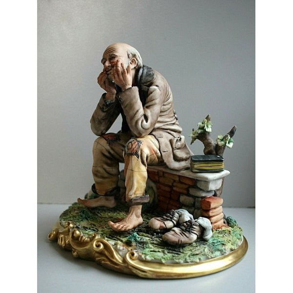 Stupenda scultura a tuttotondo in porcellana biscuit di Capodimonte dipinta con smalto policromo. Rappresentazione superba di un vagabondo, seduto su di una panchina con lo sguardo sognante mentre si tiene il volto tra le mani con i gomiti sulle ginocchia e i piedi scalzi, al suo fianco le scarpe, sulla panchina un libro e l'ombrello. Figura ricca di dettagli di eccezionale realismo. Sul basamento, è presente il marchio che ne attesta l' autenticità, una N coronata in smalto blu, numerata145/R1 Italy. L'opera è firmata sul retro del muretto "Rori".